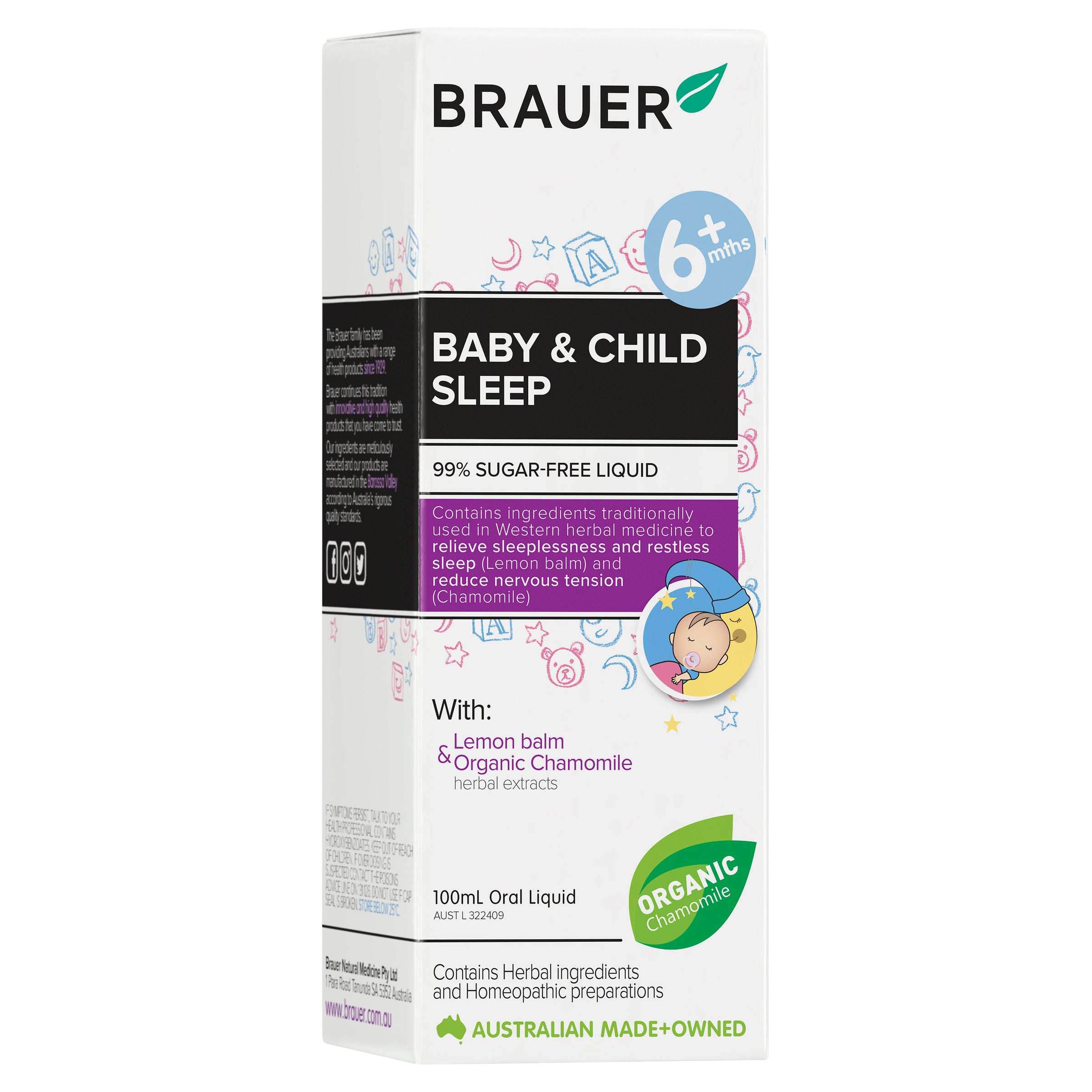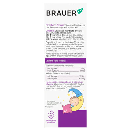 Baby & Child Sleep is a mild tasting, 100% sugar-free oral liquid formulated with Chamomile and Lemon balm - traditionally used in Western herbal medicine to temporarily relieve sleeplessness and restless sleep. Suitable from 6 months of age, Brauer Baby & Child Sleep contains no artificial colours, flavours or sweeteners.