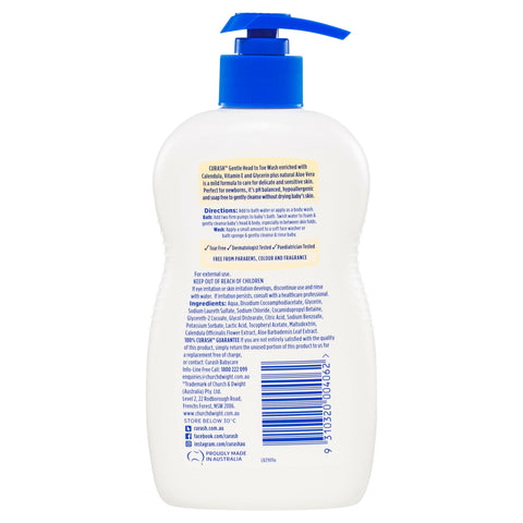 Curash Gentle Head to Toe Wash enriched with Calendula, Vitamin E and Glycerin plus natural Aloe Vera is a mild formula to care for delicate and sensitive skin. Perfect for newborns, it's pH balanced, hypoallergenic and soap free to gently cleanse without drying baby's skin.