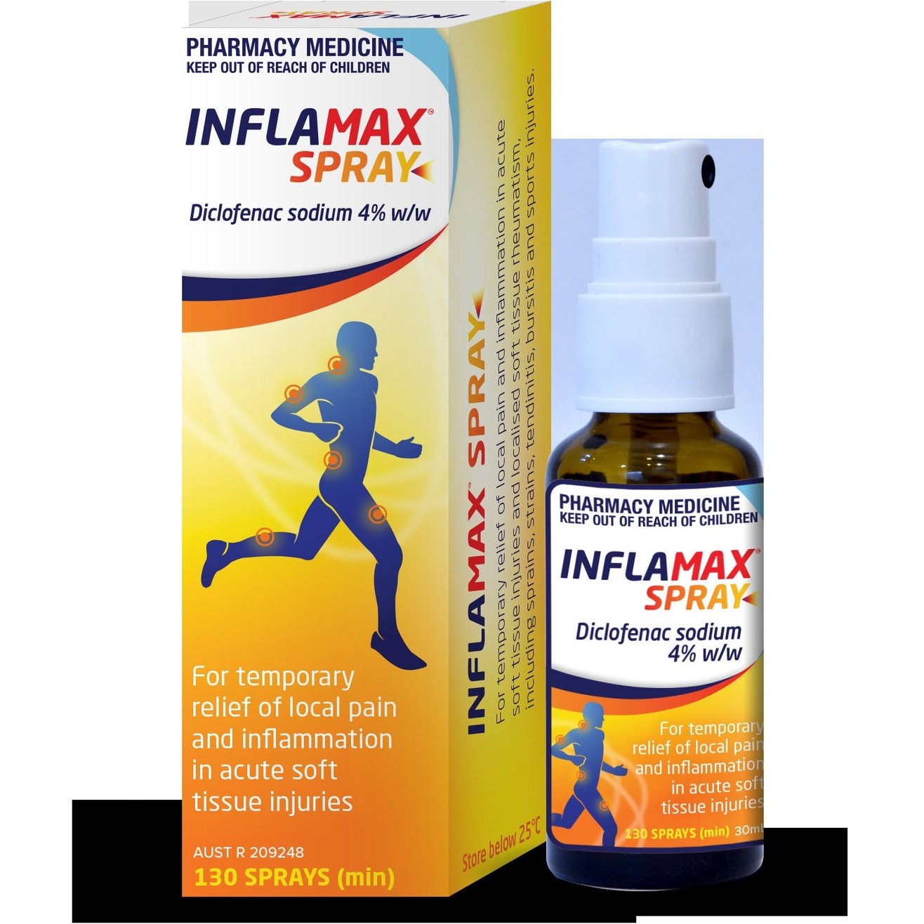 Inflamax Spray is for the temporary relief of local pain and inflammation in acute soft tissue injuries and localised soft tissue rheumatism, including: sprains strains tendinitis bursitis sports injuries. Contains 130 sprays.