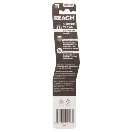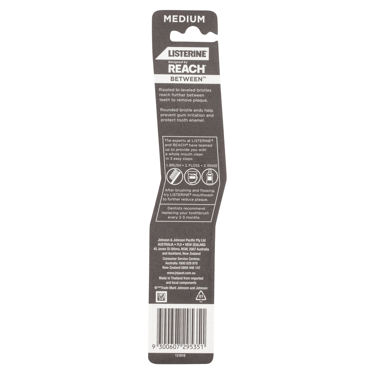 Reach Between toothbrush has bi-level bristles to reach further between teeth to remove plaque. The polished, rounded bristle ends help prevent gum irritation and protect tooth enamel. Available in soft, medium and firm.