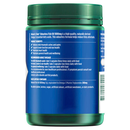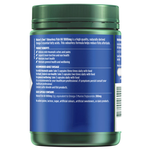 Nature’s Own Odourless Fish Oil 1000mg is a natural source of Omega 3 essential fatty acids, with an odourless formula to reduce fishy aftertaste and reflux. Omega 3 is important for the maintenance of general health and well-being, as well as for heart, brain and joint health.
