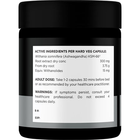 Active Ingredients Per Hard Veg Capsule: Withania Somnifera (Ashwagandha) KSM-66® Root Extract Dry Conc: 300 Mg. From Dry Root: 3.75 G. Equiv. Withanolides: 15 Mg.
