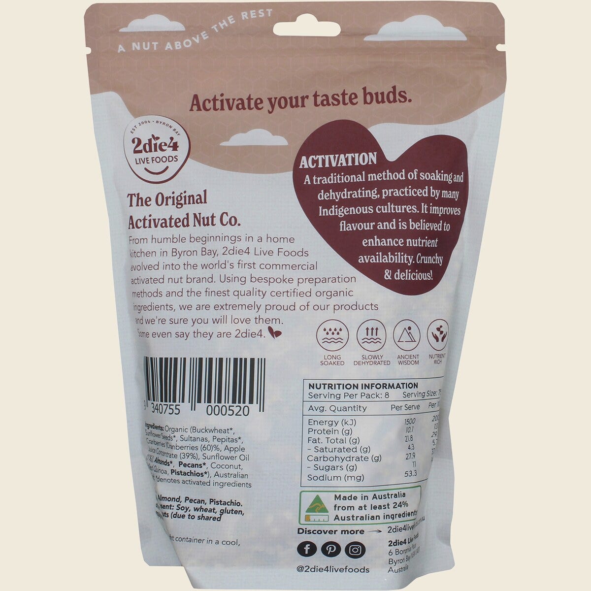 Almonds, Buckwheat, Sunflowers, Pepitas, Pecans, Pistachios, Sultanas, Cranberries, Coconut, Rolled Quinoa, Amaranth.