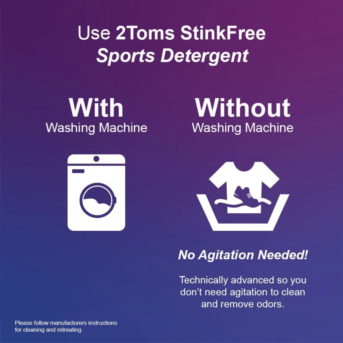 Get the Stink Out! 2Toms StinkFree Sports Detergent is a scientifically advanced detergent guaranteed to remove odours and stains in your high-performance athletic apparel and gear including hockey pads, sports bras, tech apparel, running and biking attire, backpacks, soccer shin guards, yoga pants and mats, towels, uniforms and more. StinkFree Sports Detergent treats the problem instead of just masking it and uses a high-end residue lifter to restore clothing performance and breathability.