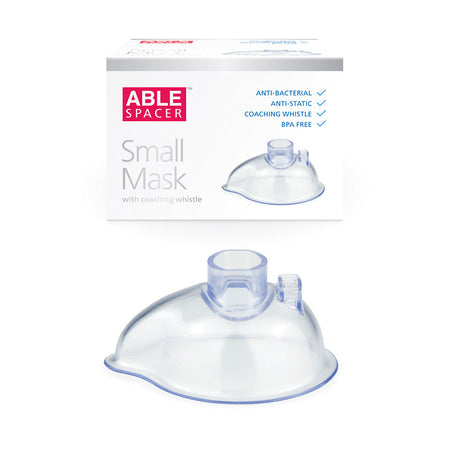 The small mask with coaching whistle is designed for infants. The whistle makes a sound at the correct inhalation rate, providing feedback to the carer when the medication is being inhaled.