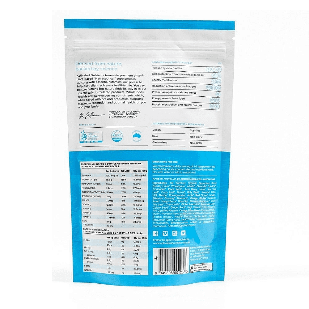 - Ingredients : AN Certified Organic Superfood Blend (Barley Grass*, Wheatgrass*, Alfalfa*, Chlorella*, Spirulina*, Coriander*, Maca Root*, Acai Berry Juice*, Aloe Vera Leaf*, Curry Leaf*, Guava*, Holy Basil*, Annatto*, Kale*, Milk Thistle*, Pomegranate*, Amla*, Red Clover*, Lemon*, Siberian Ginseng*, Beetroot*, Ginkgo Biloba*, Liquorice Root*, Maqui Berry*, Rosehip*, Shiitake Mushroom*, Green Tea Leaf*, Chamomile*, Globe Artichoke*, Rosemary Leaf*, Celery Seed*, Ginger Root*, High Vitamin D Mushroom*), AN Certified Organic Omega Fibre Blend (Flaxseed Meal*, Inulin*, Pumpkin Seed*), Sprouted and Bio-Fermented Pea Protein Isolate*, Natural Flavours, Sacha Inchi*, Acidity Regulator (Citric Acid), Cacao Powder*, Natural Sweetener (Thaumatin), Bifidobacterium longum & Lactobacillus rhamnosus