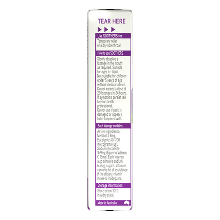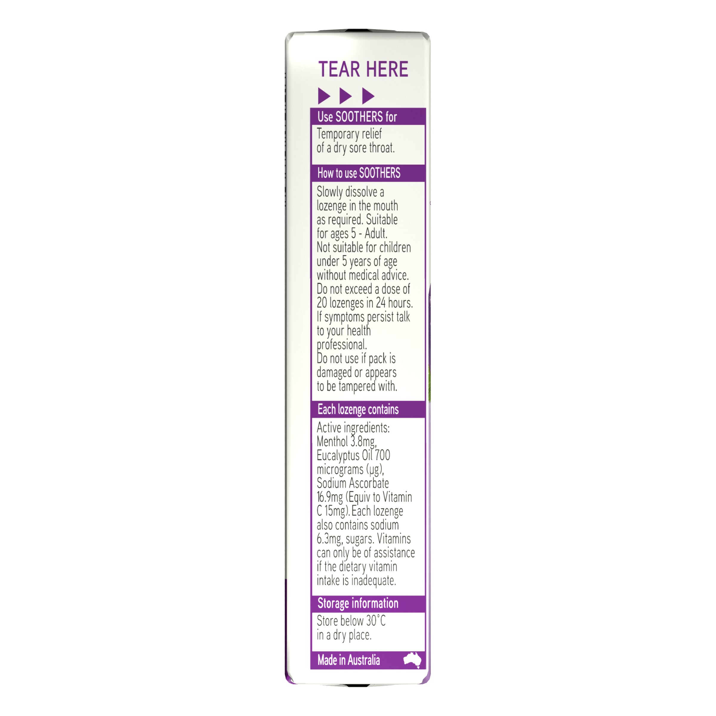 SOOTHERS Blackcurrant provides great tasting relief to a dry sore throat. With active ingredients Menthol, Eucalyptus and the added benefit of 15mg of Vitamin C, SOOTHERS Blackcurrant will soothe your throat back to health. When you feel a sore throat coming on, reach for a SOOTHERS.
