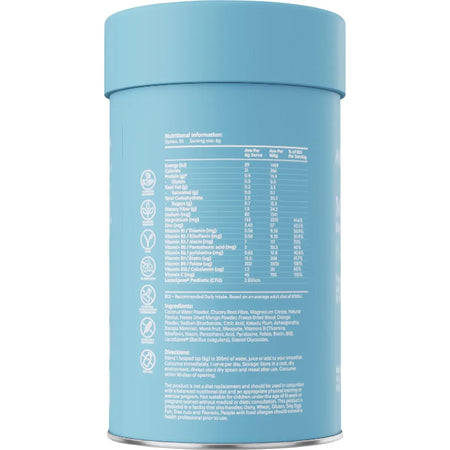 Coconut Water Powder, Chicory Root Fibre, Magnesium Citrate, Natural Flavour, Freeze Dried Mango Powder, Freeze, Dried Blood Orange Powder, Sodium Bicarbonate, Citric Acid, Kakadu Plum, Ashwagandha, Bacopa Monnieri, Monk Fruit, Mesquite, Vitamins B (Thiamine, Riboflavin, Niacin, Pantothenic Acid, Pyridoxine, Folate, Biotin, B12), Lactospore® (Bacillus Coagulans), Steviol Glycosides.