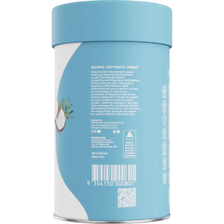 This naturally tropical mango-flavoured Magnesium Wellness Drink provides you with a daily dose of Magnesium (40% RDI) plus highly bioavailable food-sourced vitamins, minerals, pre and probiotics as well as ayurvedic herbs.