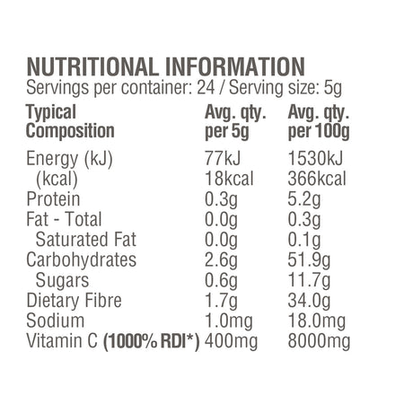 With over 500mg of wholefood Vitamin C per serve (the equivalent of 9 small oranges) plus prebiotics, probiotics and aloe vera to aid in optimal digestion, Amazonia Raw prebiotic vitamin c is a complete formula designed to support optimum health all year round.