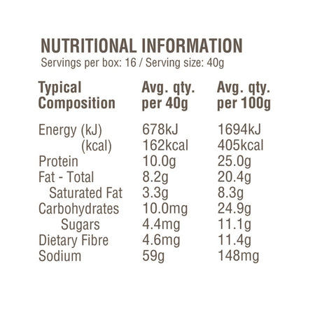 Protein and Fibre Blend (Soluble Fibre (Tapioca), Peanuts, Rice Protein, Pea Protein Isolate), Brown Rice Syrup, Cocoa Butter, Peanut Butter 5%, Dark Choc Drizzle 4.5%, Cocoa Powder, Natural Flavours, Emulsifier (Sunflower Lecithin), Sea Salt, Antioxidant (Vitamin E), Sweetener (Steviol Glycosides).AC202CPP