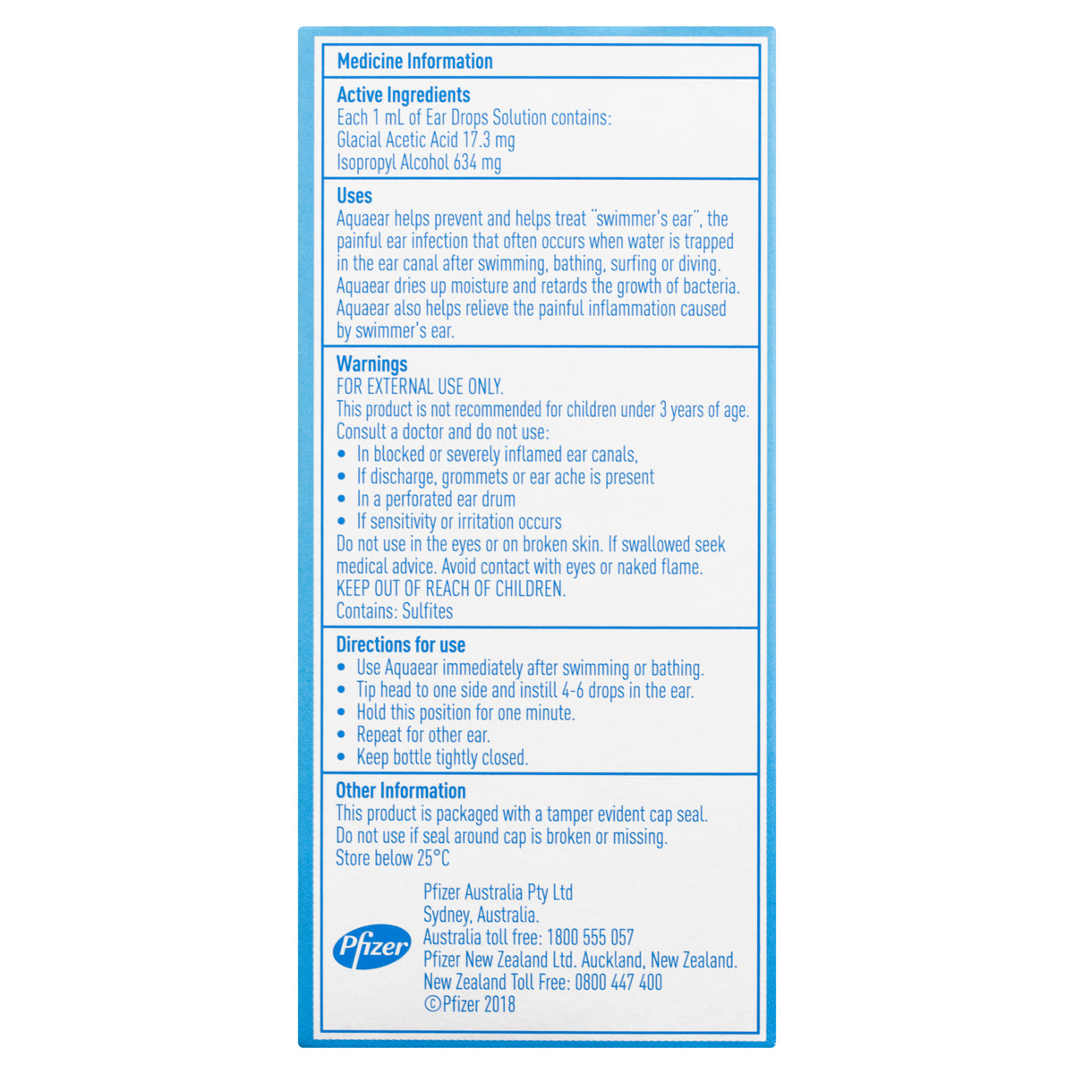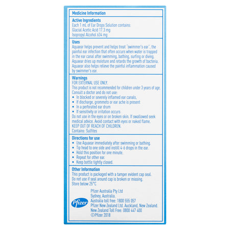 Uses: Aquaear helps prevent and helps treat "swimmer's ear", which can occur when water is trapped in the ear canal after swimming, bathing, surfing or diving. Aquaear dries up moisture and retards the growth of bacteria. Aquaear also helps relieve the painful inflammation caused by swimmer's ear.Boxed Contents: 35mL liquid