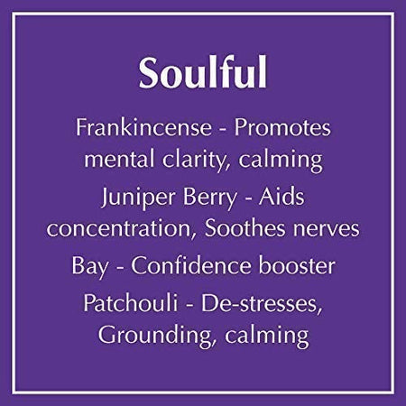 Soulful's blend of essential oils will lift your mind and invigorate your senses giving you the mental energy you need to find release from nervous tension and fatigue. This exotic, woody aroma unites top notes of spicy Frankincense and fruity Juniper Berry with the fragrant base notes of Patchouli to provide a warming, relaxing, and deeply calming experience, helping to soothe jangled nerves and restore mental clarity.