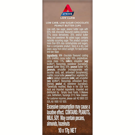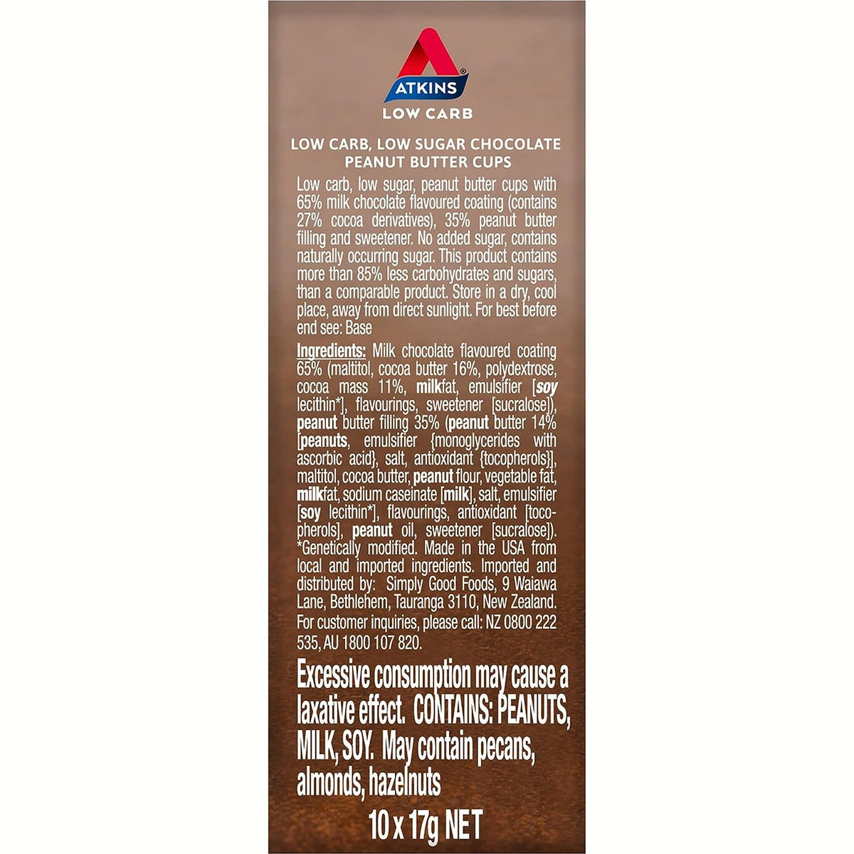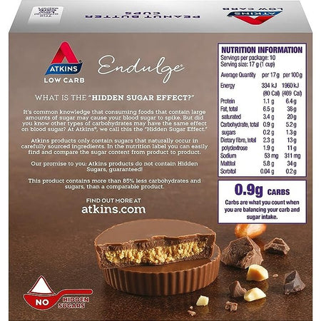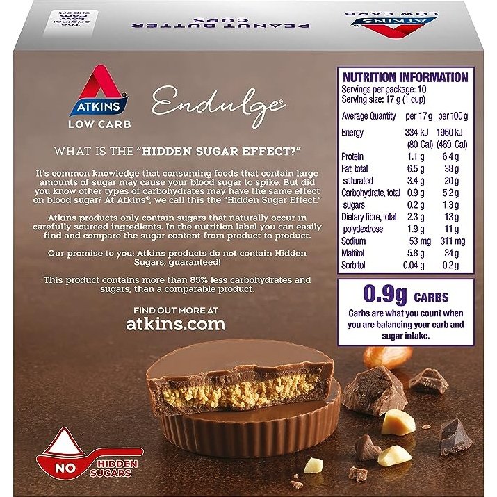 Enjoy the delicious taste of Atkins Peanut Butter Cups without guilt. This 10-pack contains 17g of protein per cup, making it a great snack for those looking to snack smart. Perfect for fitness enthusiasts and health-conscious eaters, they provide an indulgent treat free of added sugar and preservatives.