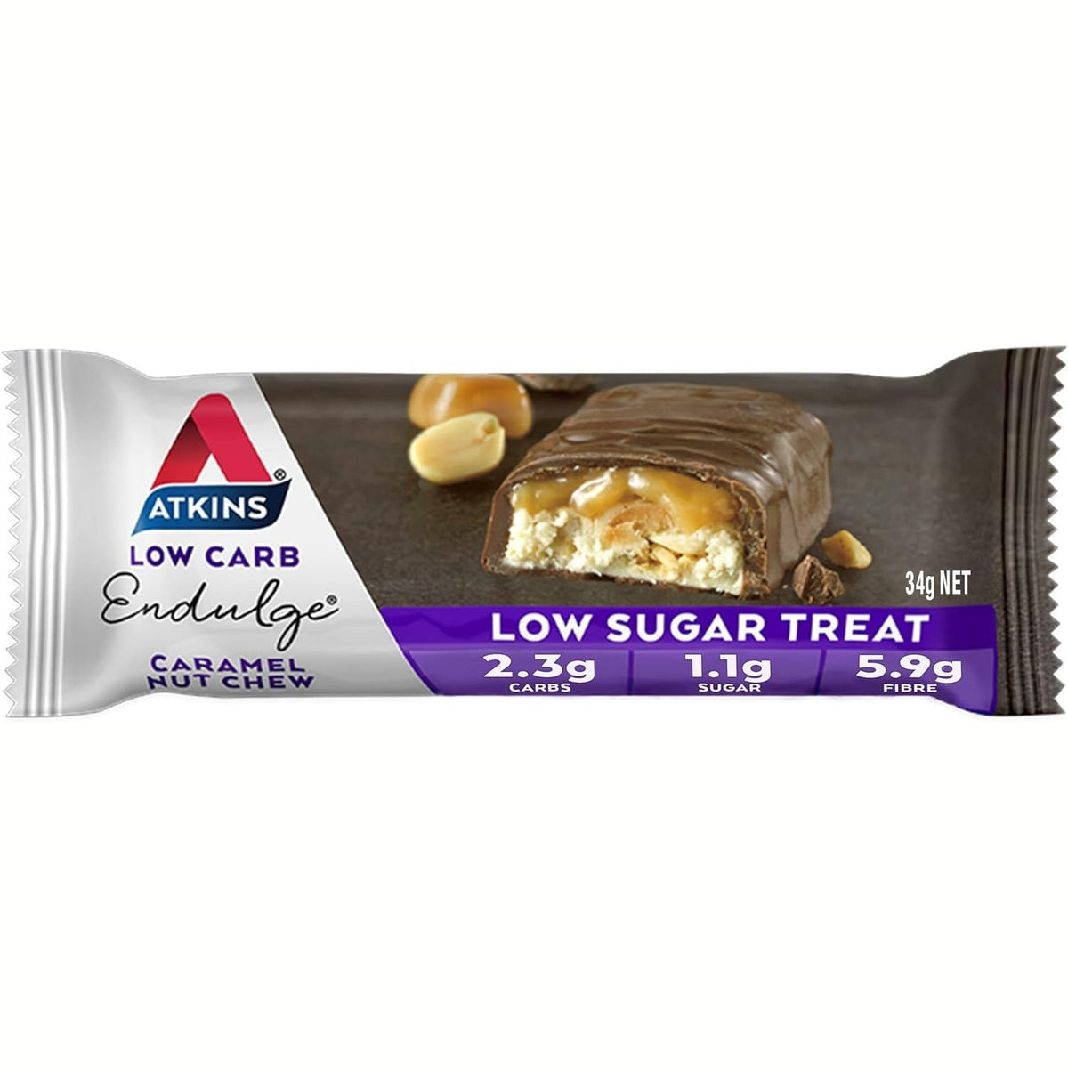 Guilt-free treats. Just like traditional favourites - without the sugar-fuelled carbohydrates. Chocolate, caramel and peanut avour, low carb, low sugar bar with 33% milk chocolate (contains 38% cocoa derivatives) and sweetener. No added sugar, contains naturally occurring sugars. This product contains over 75% less carbohydrates and sugars than regular chocolate, caramel and peanut avoured bars.