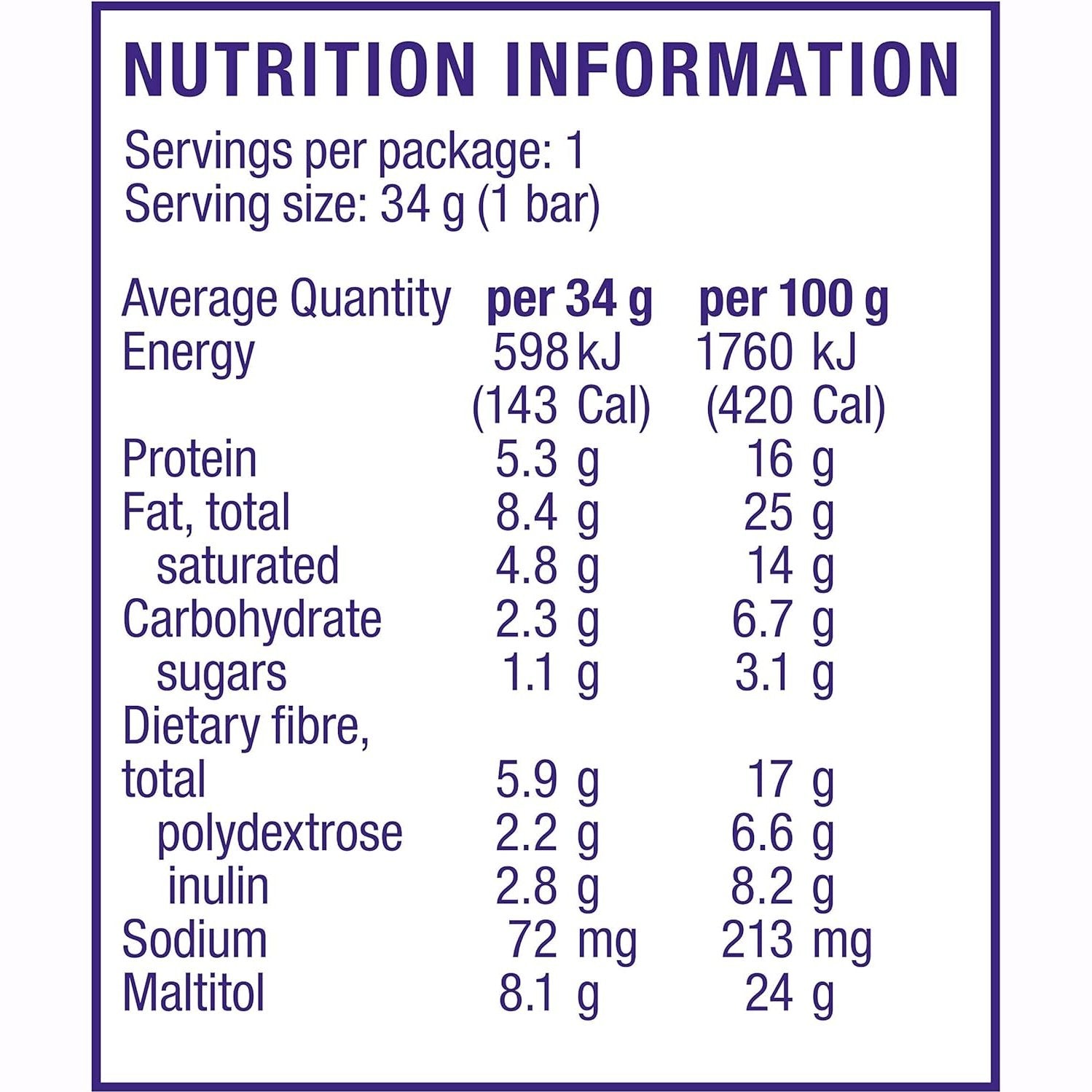 Chocolate 33% (maltitol, chocolate mass, cocoa butter, sodium caseinate, milk fat, emulsifier [soy lecithin], sweetener [sucralose], flavourings, salt),Ā caramel flavoured layer 26% (inulin, polydextrose, water, butter [cream, salt], vegetable fat, nonfat dry milk, emulsifier [soy lecithin], salt, sweetener [sucralose], flavouring), roasted peanuts 14%, maltitol syrup, protein blend (whey protein isolate, milk protein isolate), butter (cream, salt), peanut butter (peanuts, emulsifierĀ [mono and diglycerides], salt, antioxidant [mixed tocopherols]), inulin, flavouring, sweetener (sucralose).
