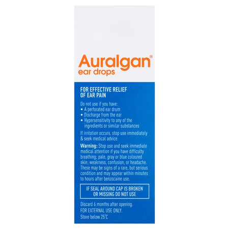 Auralgan Ear Drops is specifically formulated with Benzocaine, a local anaesthetic and Phenazone, an analgesic to provide effective relief of the pain associated with Otitis Media.Boxed Contents: 15mL Liquid