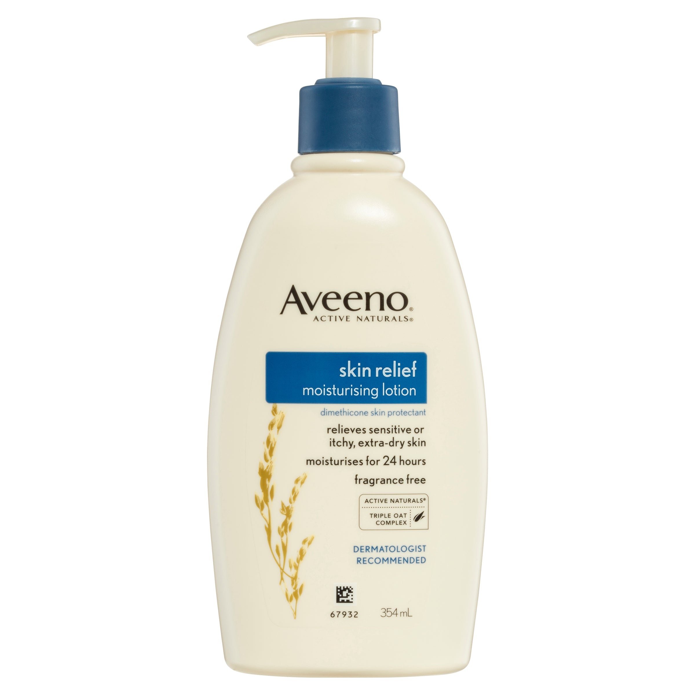 Aveeno Active Naturals Skin Relief Moisturising Lotion with dimethicone skin protectant relieves sensitive or itchy, extra-dry skin and moisturises for 24 hours. Rich yet fast absorbing, this hydrating moisturiser starts to work immediately to nourish and restore essential moisture to very dry or sensitive skin so that it looks and feels healthier.Â- Clinically shown to help relieve dry itchy skin.