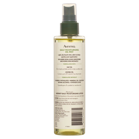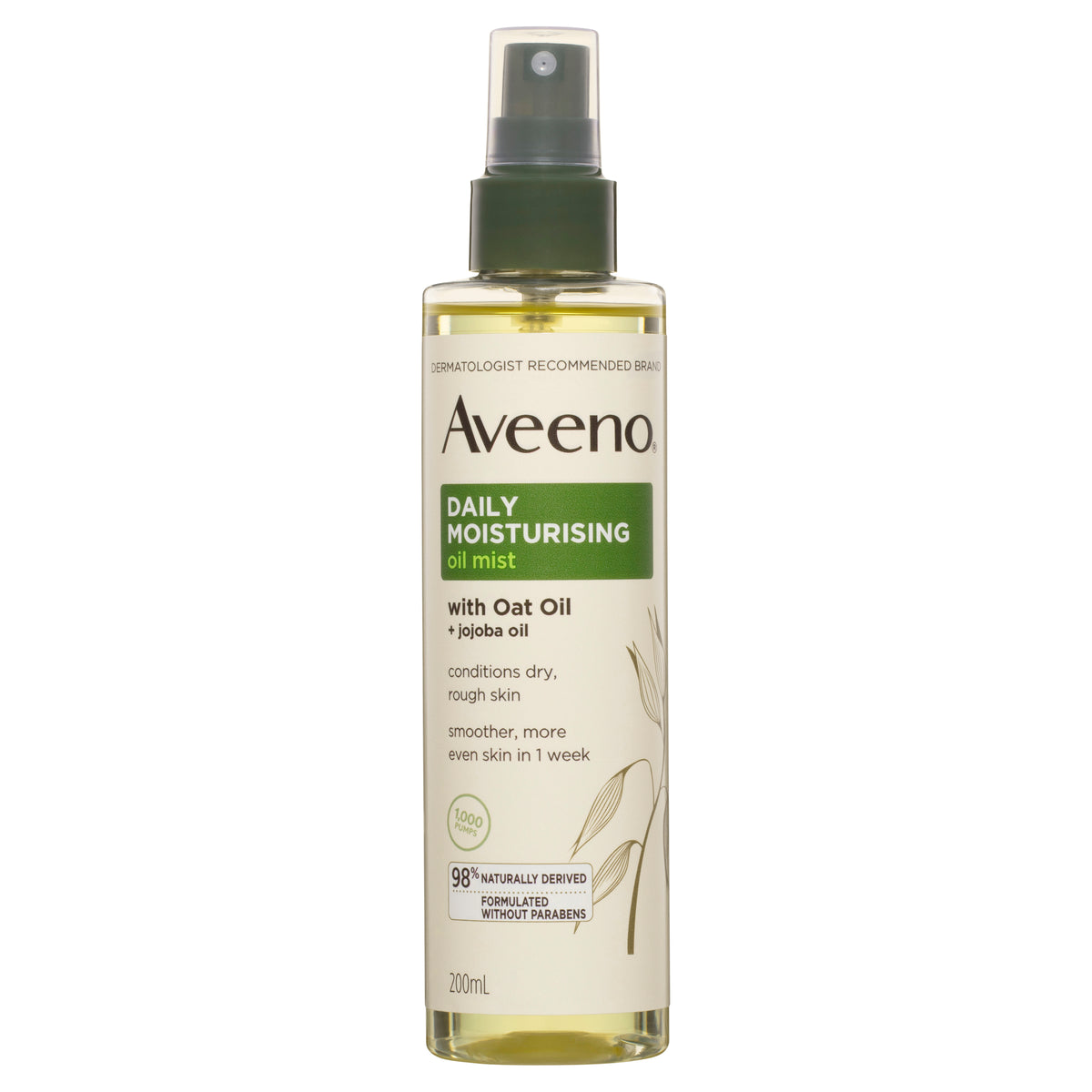 Aveeno Daily Moisturising Oil Mist with oat oil plus jojoba oil. 98% naturally derived and formulated without parabens. For conditions of dry, rough skin. Smoother, more even skin in 1 week.