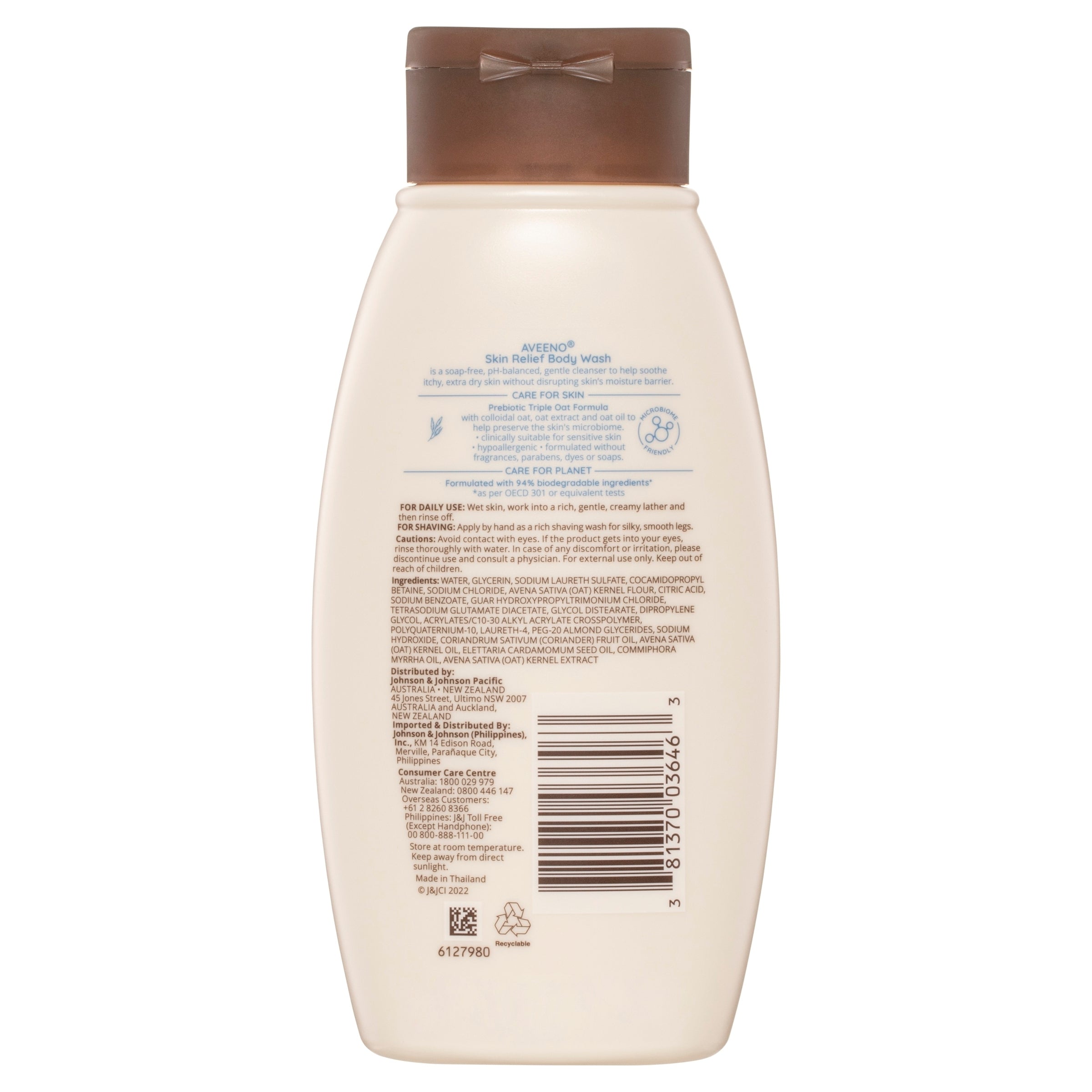 Aveeno Active Naturals Skin Relief Body Wash for itchy dry skin contains skin soothing colloidal oatmeal for a moisturising body wash. This fragrance free body wash is gentle enough for sensitive skin and is soap free, dye free and hypoallergenic.