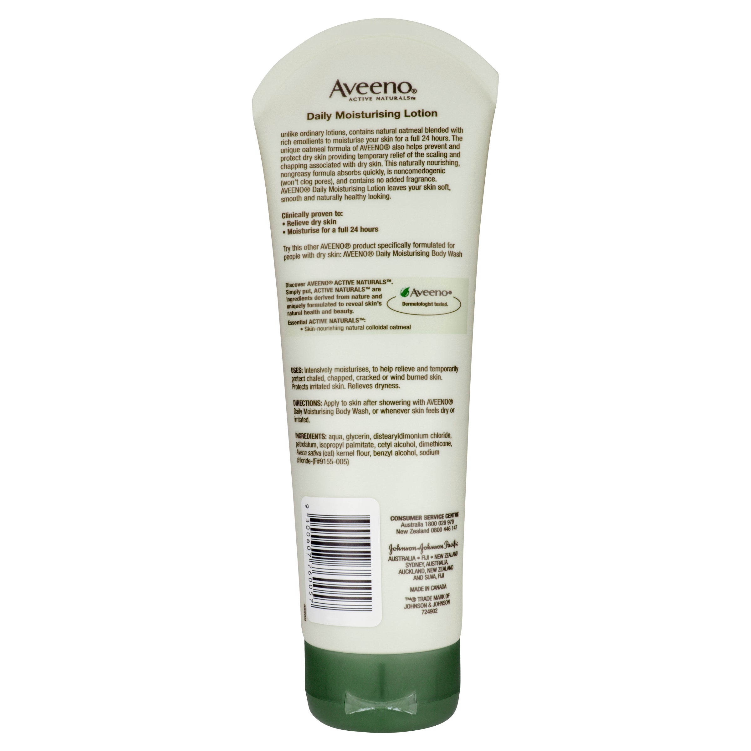Aveeno active naturals daily moisturising lotion, unlike ordinary body lotions, contains natural oatmeal blended with rich emollients to moisturise your skin for a full 24 hours. The unique oatmeal formula of Aveeno also helps prevent and protect dry skin providing temporary relief of the scaling and chapping associated with dry skin.This naturally hydrating, non greasy moisturiser formula is: