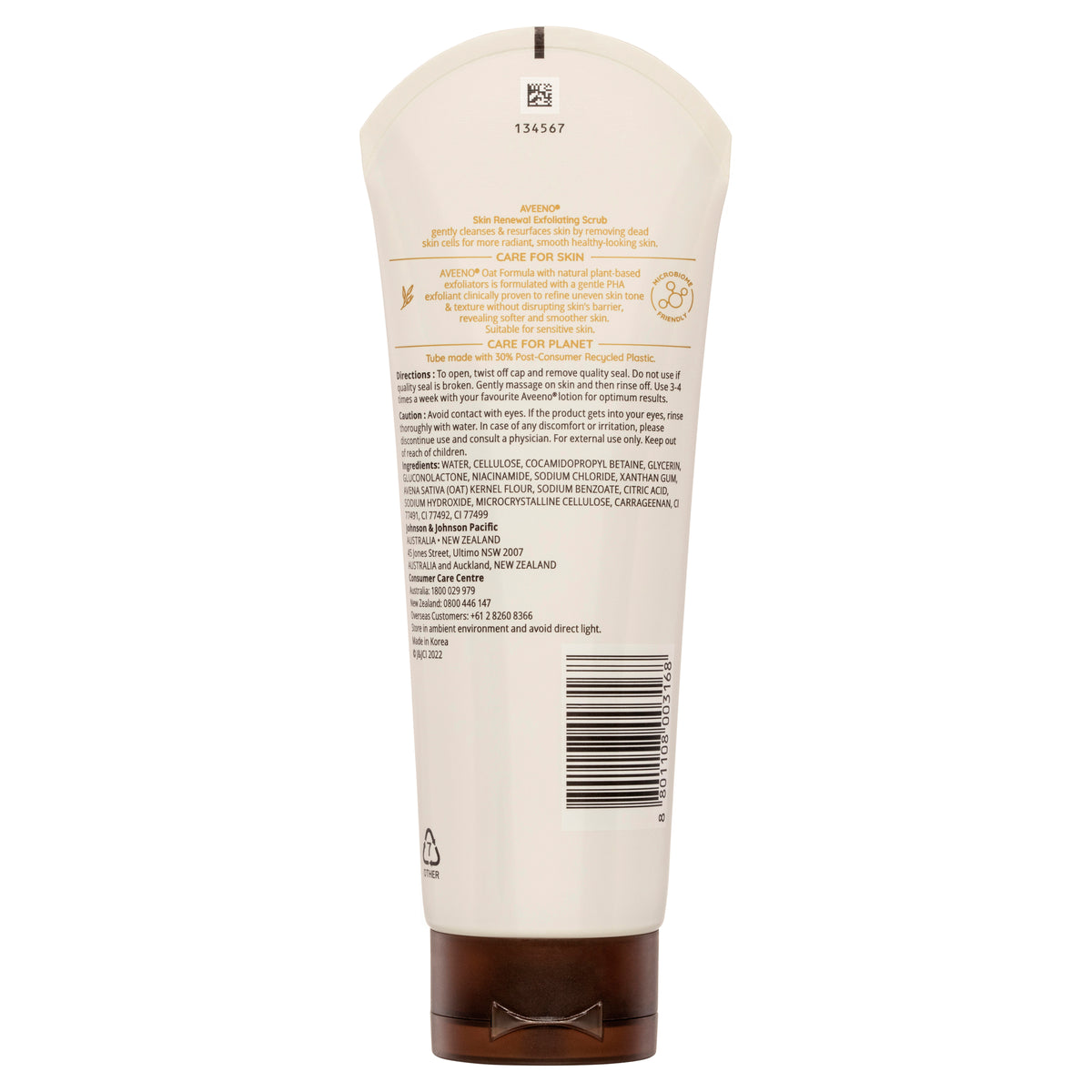 AVEENO® Skin Renewal Exfoliating Scrub gently cleanses & resurfaces the skin by removing dead skin cells for more radiant, smooth healthy-looking skin.AVEENO ® Colloidal Oat Formula with natural plant-based exfoliators is formulated with a gentle PHA exfoliant clinically proven to refine uneven skin tone & texture without disrupting skin's barrier, revealing softer and smoother skin. Suitable for sensitive skin.