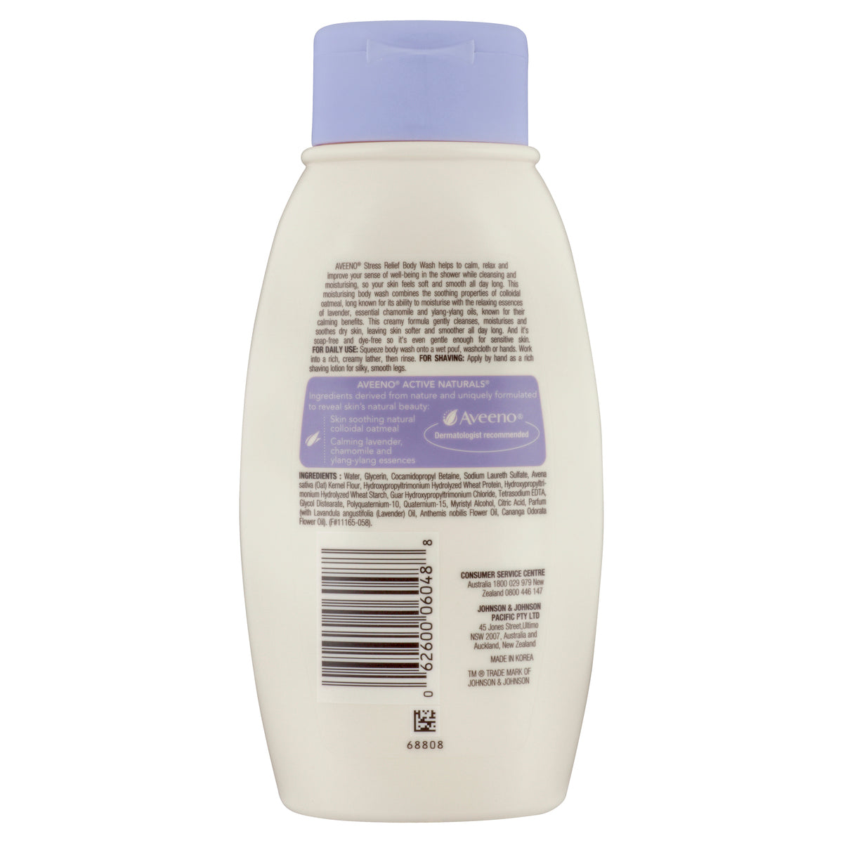 Aveeno Stress Relief Body Wash helps to calm, relax and improve your sense of wellbeing in the shower while cleansing and moisturising, so your skin feels soft and smooth all day long. This moisturising body wash combines the soothing properties of colloidal oatmeal, long known for its ability to moisturise with the relaxing essences of lavender, essential chamomile and ylangylang oils, known for their calming benefits. This creamy formula gently cleanses, moisturises and soothes dry skin, leaving skin softer and smoother all day long. And it's soapfree and dyefree, so it's even gentle enough for sensitive skin.