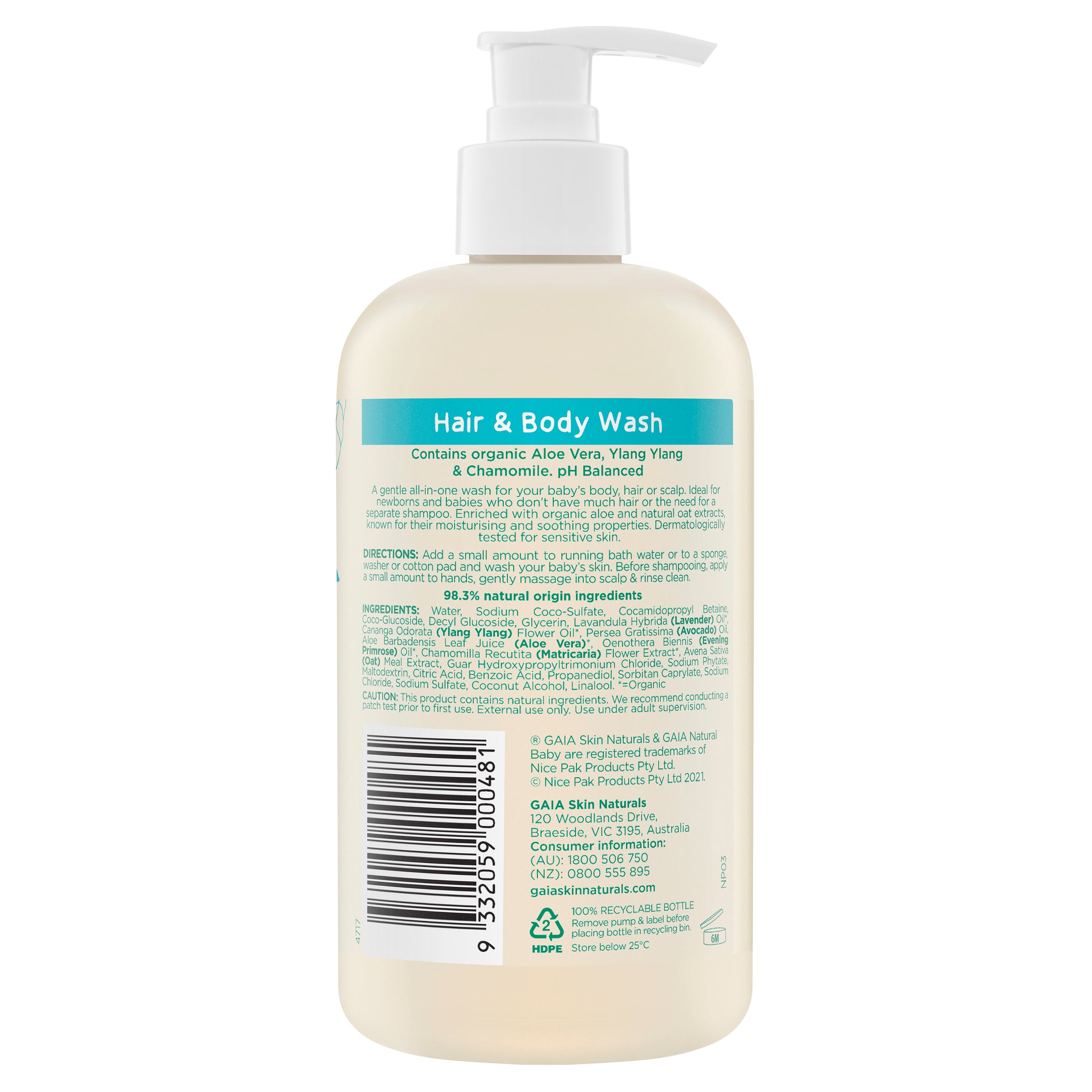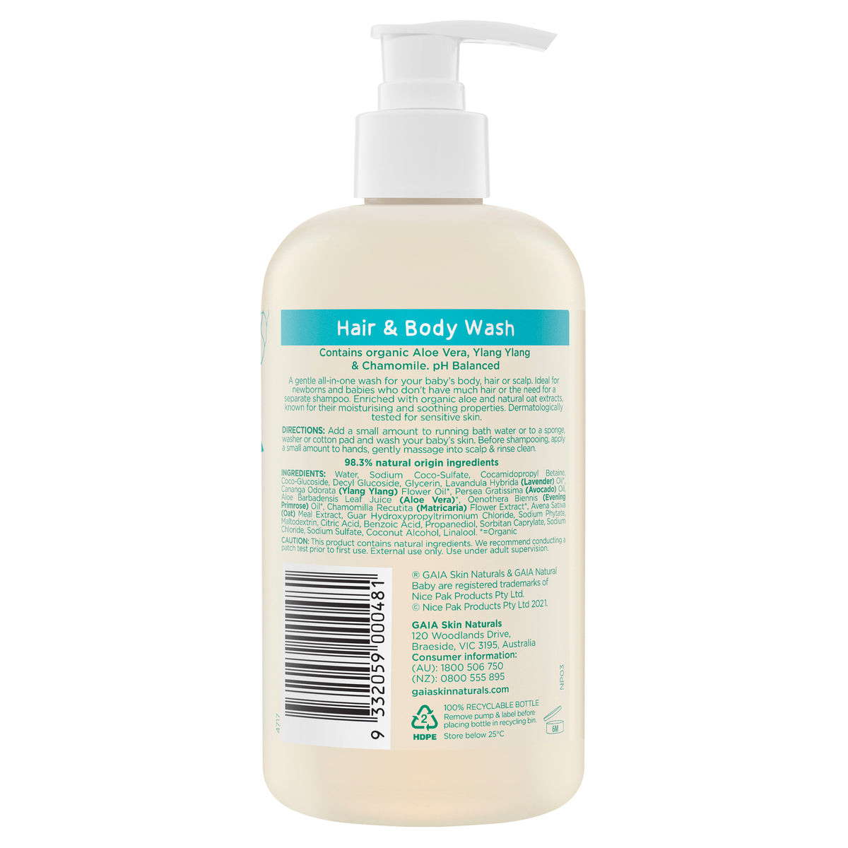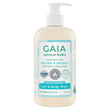 Formulated for everyday use, this soap-free 2-in-1 body cleanser & shampoo is pH balanced so it won't strip baby's natural protective oils or cause dryness. Enriched with GAIA's pure essential oil blend of organic Aloe Vera and organic Ylang Ylang which are known for their calming properties. The GAIA Hair & Body Wash uses gentle coconut derived cleansing agents (no sulphates) for a gentle yet thorough cleanse. Organic Evening Primrose Oil helps to nourish and soften skin and organic Chamomile extract enhances natural highlights and adds shine. Dermatologically tested and suitable for sensitive skin.FREE FROM: