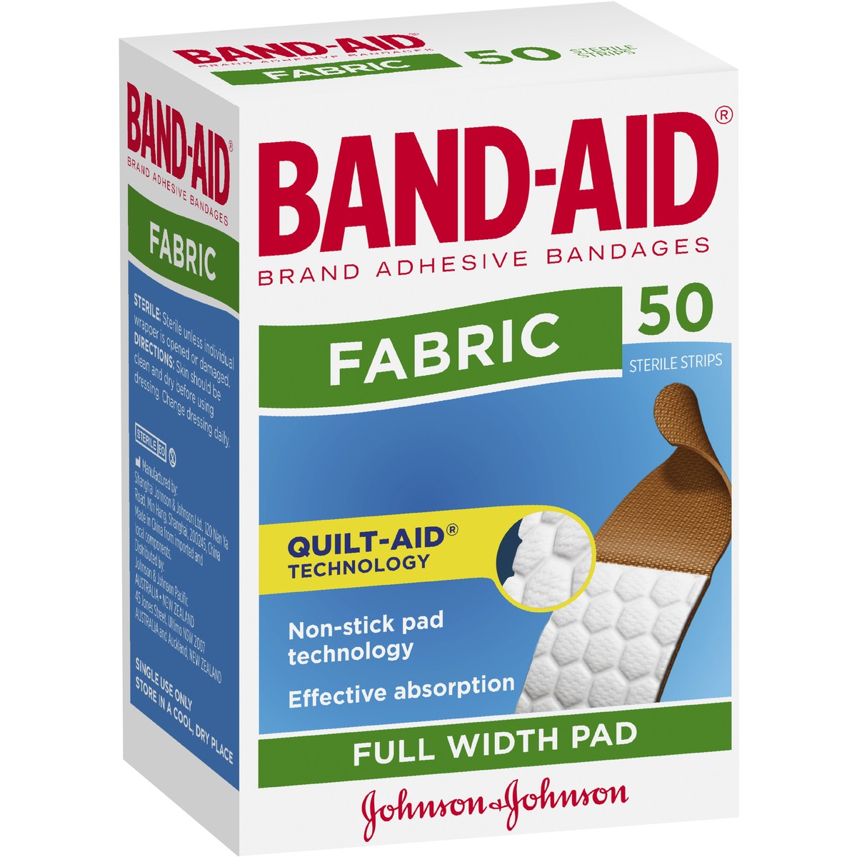 Band-Aid Brand Adhesive Fabric Bandages the most advanced way to keeping cuts clean and getting scrapes protected fast. The non-stick Quilt-Aid pad ensures effective absorption, healing cuts twice as fast. Inside every Band-Aid Brand Adhesive plastic bandage you'll find these technologies: Quilt-Aid Technology: Non-stick pad technology. A unique quilted pad which draws fluid away from the wound. Breathability: All purpose strip with micro-vents for breathable protection. Side seals around pad to help protect your wounds against infection. Band-Aid Brand Adhesive Bandages help cuts heal twice as fast as uncovered cuts.