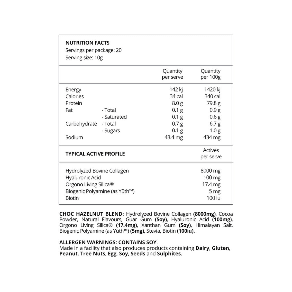 Hydrolyzed Bovine Collagen (8000mg), Cocoa Powder, Natural Flavours, Guar Gum (Soy), Hyaluronic Acid (100mg), Orgono Living Silica® (17.4mg), Xanthan Gum (Soy), Himalayan Salt, Biogenic Polyamine (as YüthTM) (5mg), Stevia, Biotin (100iu).