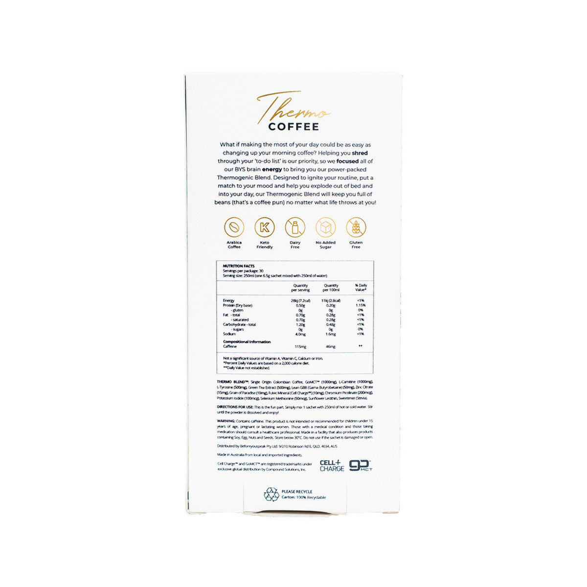 Thermo CoffeeWhat if making the most of your day could be as easy as changing up your morning coffee? Helping you shred through your ‘to-do list’ is our priority, so we focused all of our BYS brain energy to bring you our power-packed Thermogenic Blend. Designed to ignite your routine, put a match to your mood, and help you explode out of bed and into your day, our Thermogenic Blend will keep you full of beans (that’s a coffee pun) no matter what life throws at you! Single Origin Colombian Coffee 115mg Caffeine, Go MCT™ 1000mg, L-Carnitine 1000mg, L-Tyrosine 500mg, Green Tea Extract 500mg, Lean GBB (Gama Butyrobetaine) 50mg, Zinc Citrate 15mg, Grain of Paradise 10mg, Fulvic Mineral (Cell Charge™) 10mg, Chromium Picolinate 200mcg, Potassium Iodide 100mcg, Selenium Methionine 50mcg, Sunflower Lecithin, Sweetener (Stevia). Simply stir 1 sachet with 250ml of hot or cold water. Consume in the morning, pre-workout, or whenever you need to BURN.