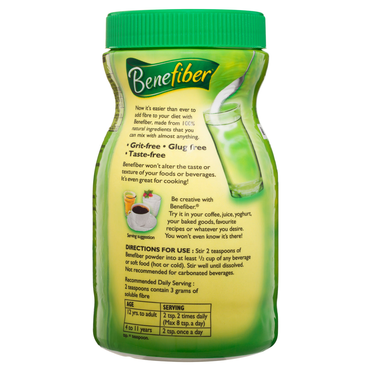 HOW TO ADD BENEFIBER NATURAL FIBRE SUPPLEMENT TO YOUR DAILY ROUTINE: Stir 2 teaspoons of Benefiber powder into at least 1/2 cup of beverage or soft food (hot or cold). Stir well until dissolved. Not recommended for carbonated beverages. Recommended Daily Serving: 2 teaspoons contain 3 grams of soluble fibre Age: 12 years to adult, Serving: 2 tsp 2 times daily (Max 8 tsp a day)Age: 4 to 11 years, Serving: 2 tsp once a day tsp = teaspoon.