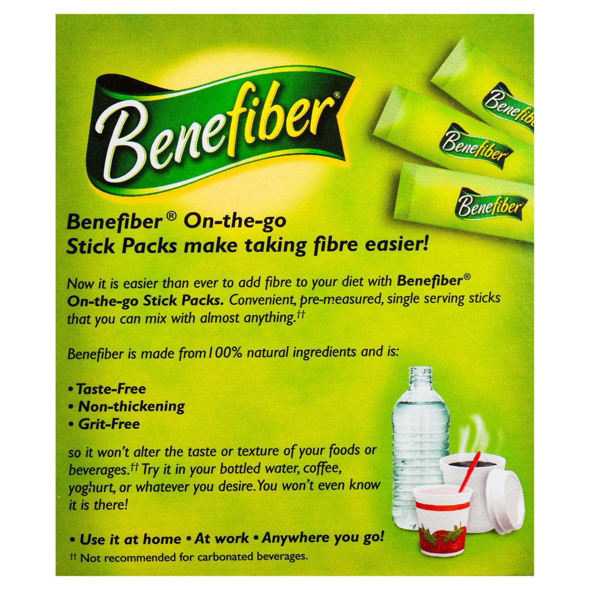 Now it is easier than ever to add fibre to your diet with Benefiber On-the-go Stick Packs. Convenient, pre-measured, single-serving sticks that you can mix with almost anything (not recommended for carbonated beverages).