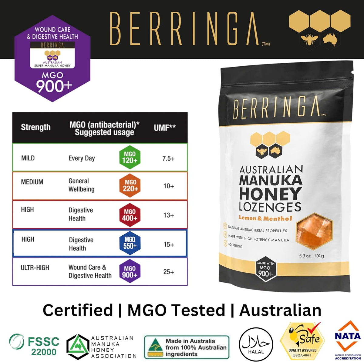 Berringa Australian Manuka Honey Lozenges Lemon & Menthol (Made With MGO 900+) X 30 Pack (150g)