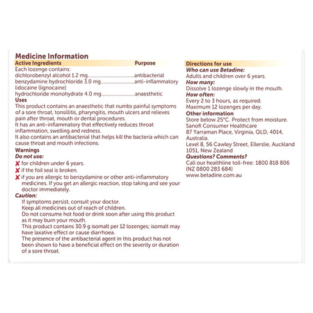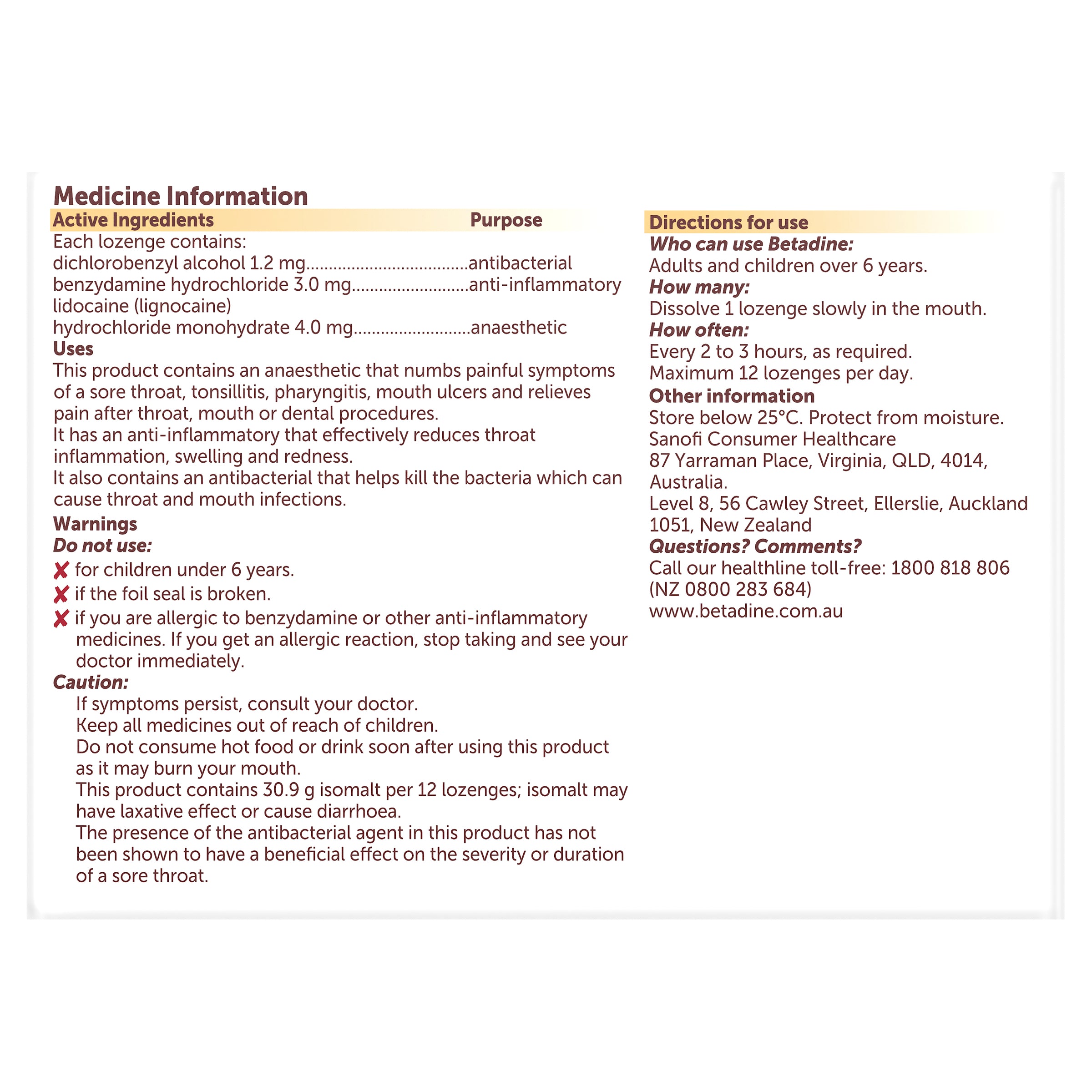 Each Betadine Anaesthetic Lozenge contains an anti-inflammatory agent to aid in the reduction of throat inflammation.