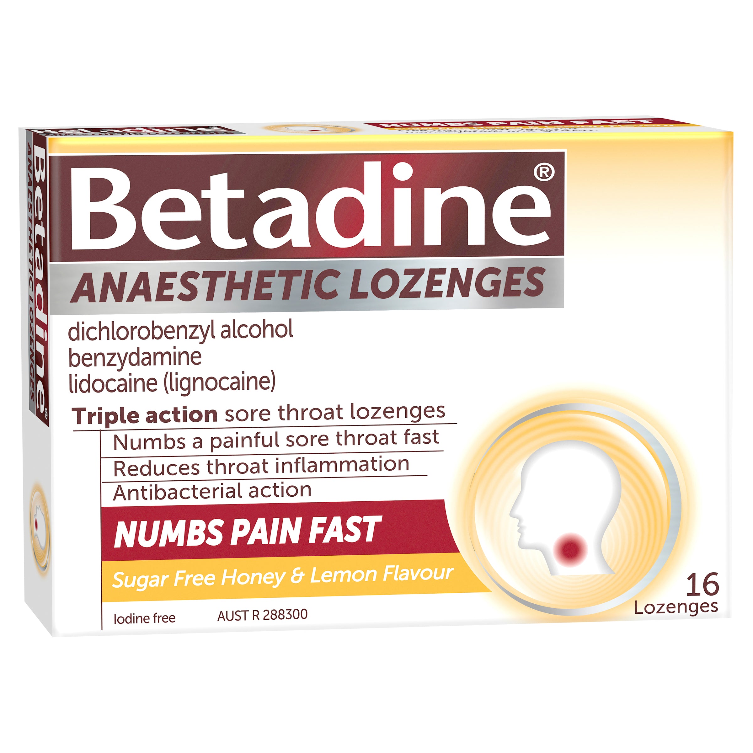 Betadine Anaesthetic Lozenges contain anaesthetic agents that work to rapidly numb pain.