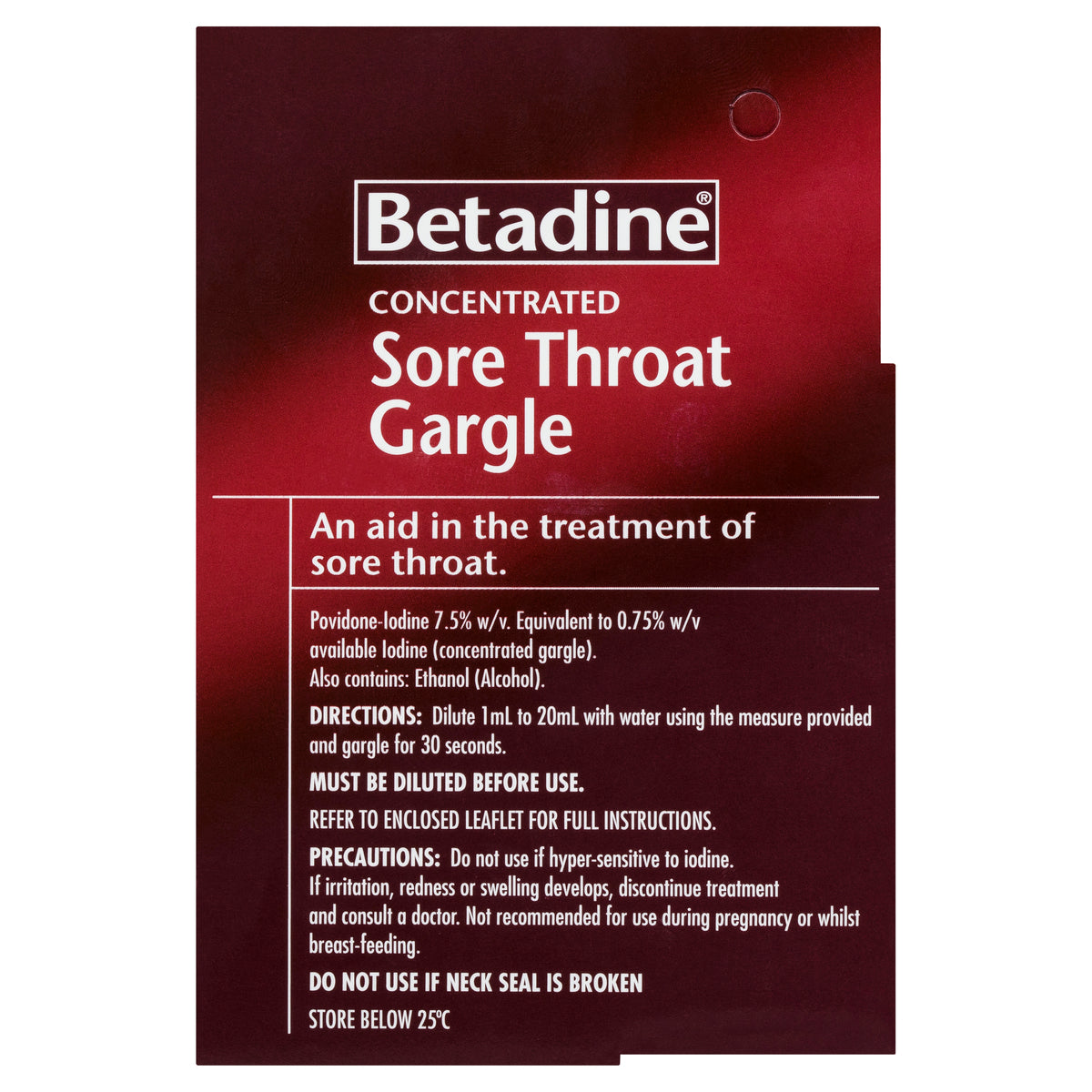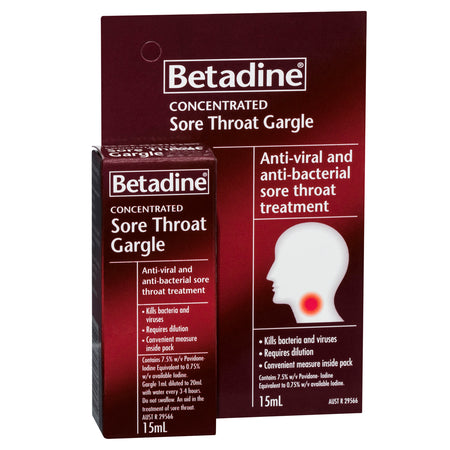 Betadine Sore Throat Gargle (Concentrated) 15ml is a concentrated anti-viral and anti-bacterial formula used as an aid in the treatment of sore throats.
