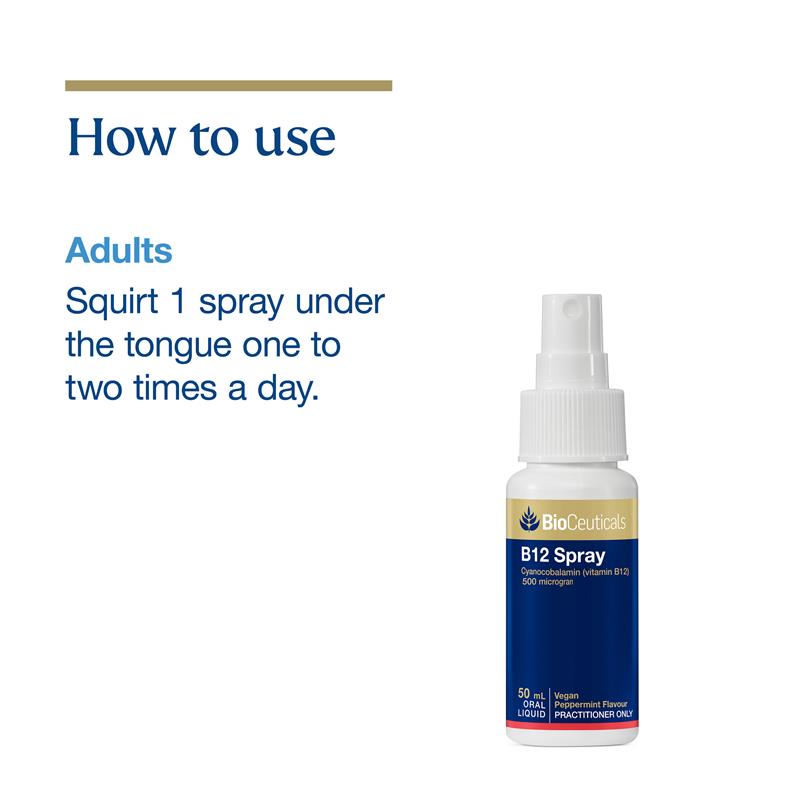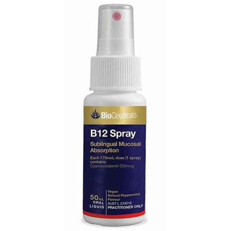 This supplement also supports your body’s production of healthy red blood cells and supports your immune system function and nervous system health.BioCeuticals B12 Oral Spray also offers a method of absorption in a vegetarian and vegan-friendly formula.