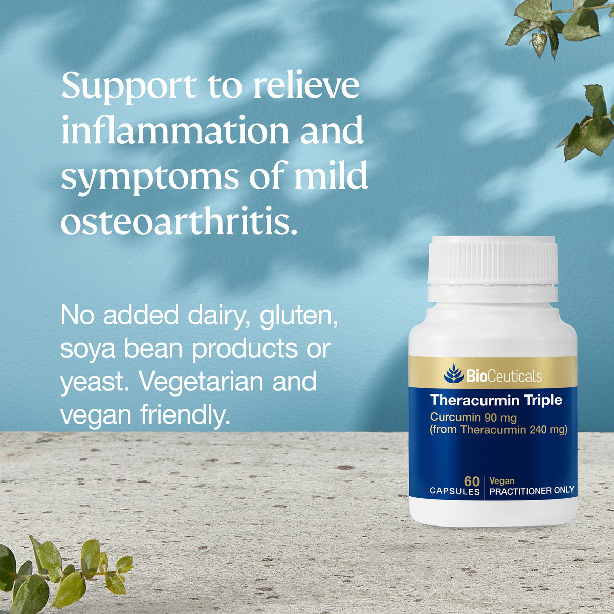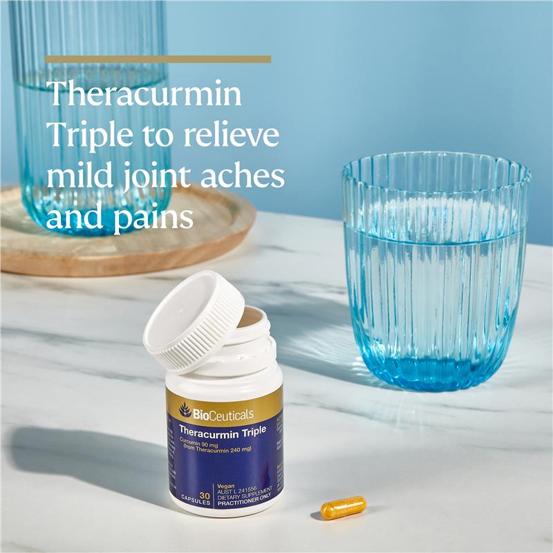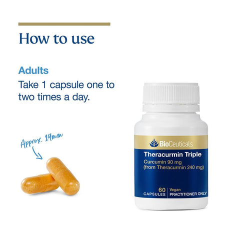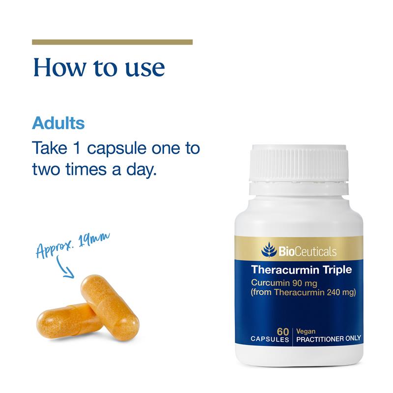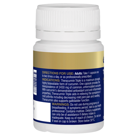 Theracurmin Triple is a high-dose, highly bioavailable form of curcumin. One capsule contains a formulated form of curcumin, Theracurmin, providing the bioequivalence of 2430 mg of common, unformulated curcumin. Curcumin has demonstrated antioxidant and anti-inflammatory properties. Theracurmin Triple aids in relieving the symptoms of mild osteoarthritis including decreasing mild joint pain and swelling. Theracurmin also supports gallbladder function.Suitable For: Adults only or as professionally prescribed