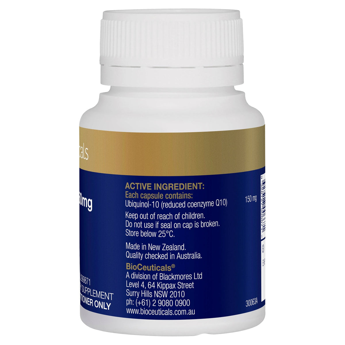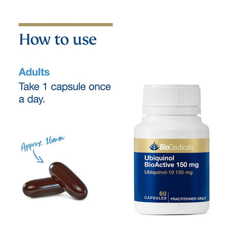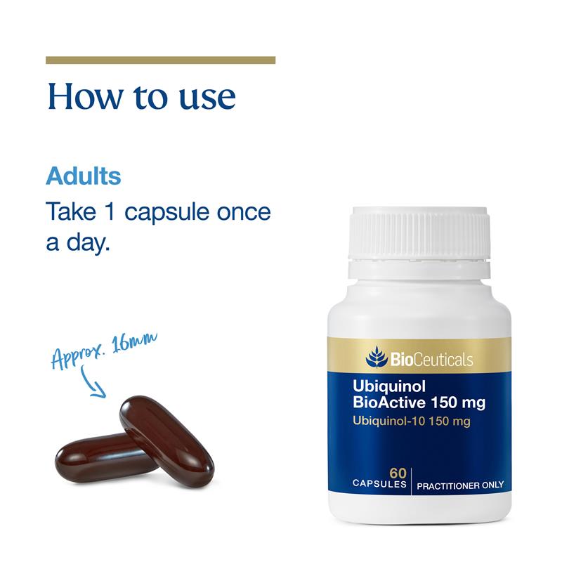Support your heart health with BioCeuticals Ubiquinol BioActive 150mg capsules. This practitioner supplementcontains CoQ10, an antioxidant your body produces for growth and maintenance. Levels of CoQ10 in your