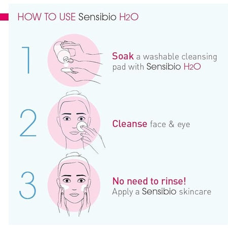 Soak a cotton pad with Sensibio H2O. Gently cleanse and/or remove makeup from your face and eyes. Re-apply until the cotton pad becomes clean. Gently pat the skin to dry. Do not rinse. For daily use, morning and/or night.