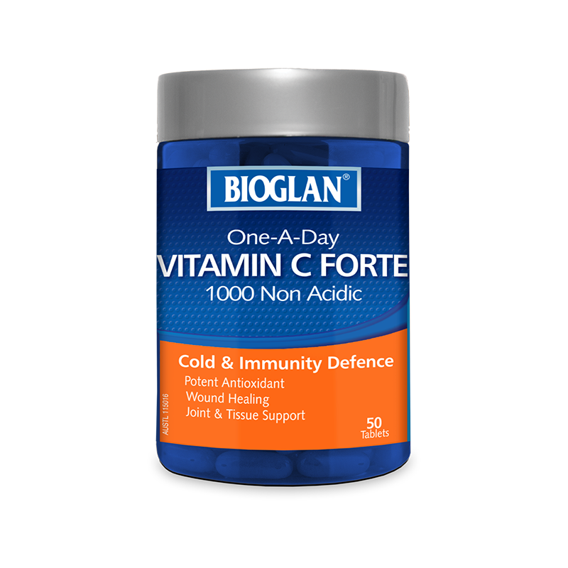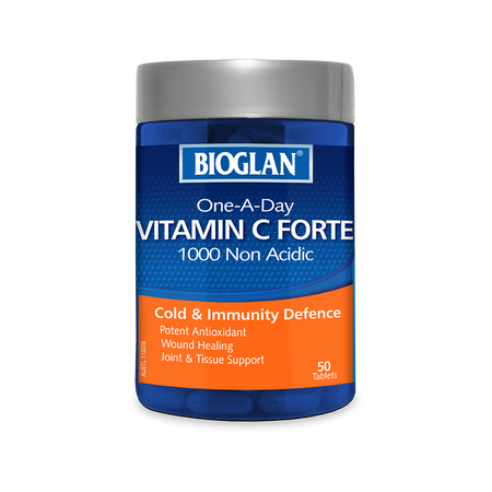 Bioglan's One - A - Day Vitamin C Forte is a non acidic form of Vitamin C that contains Hesperidin and Rutin, which are bioflavanoids found in food. Bioglan's Vitamin C Forte is great for cold and flu defence, wound healing and joint and tissue support. 50 tablets