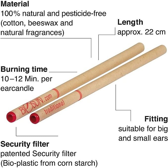 Handmade in a loving manner, we use only the best, regularly tested, and 100% natural ingredients.With honey, sage, and chamomile. Biosun Ear candles are about 22cm long and have a burning time of approximately 10–12 minutes.