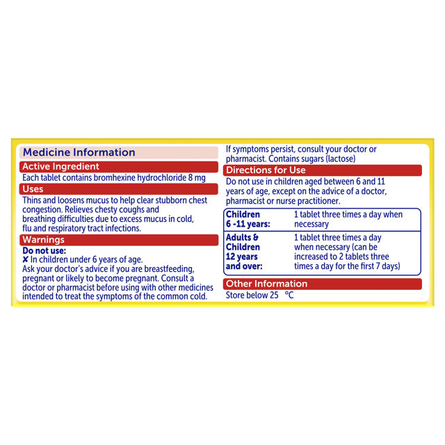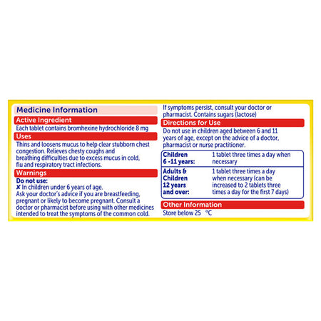Bisolvon Chesty Forte Tablets thins, loosens and clears mucus from the chest and helps clear stubborn chest congestion. Bisolvon Chesty Forte Tablets are small and easy to swallow, making them a great choice for relieving chesty coughs when on the go. The non-drowsy formula means you can take them when you're working or driving.