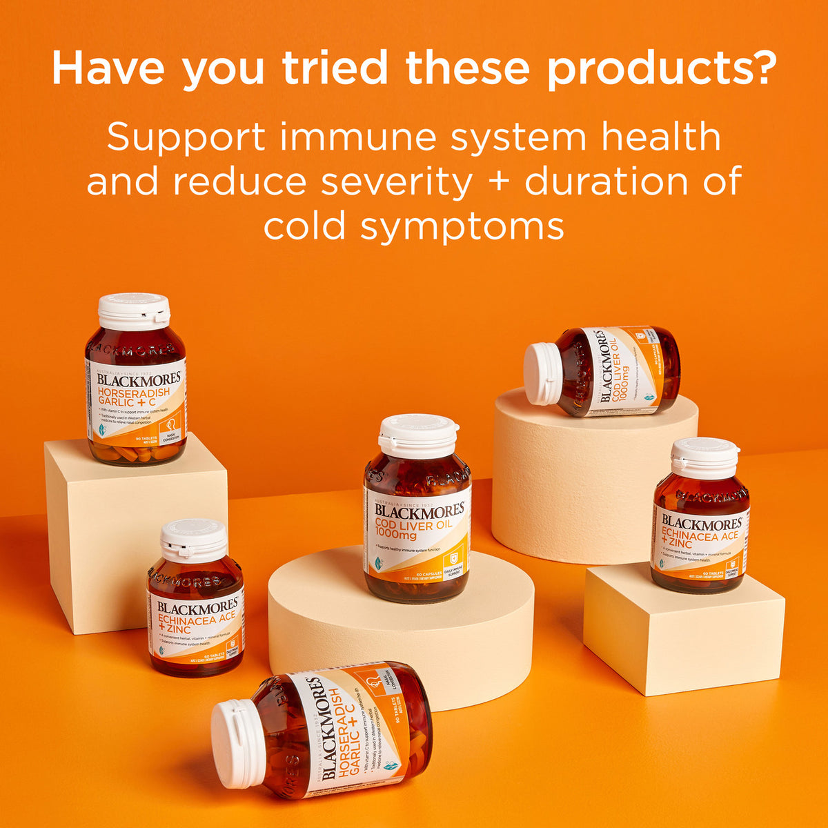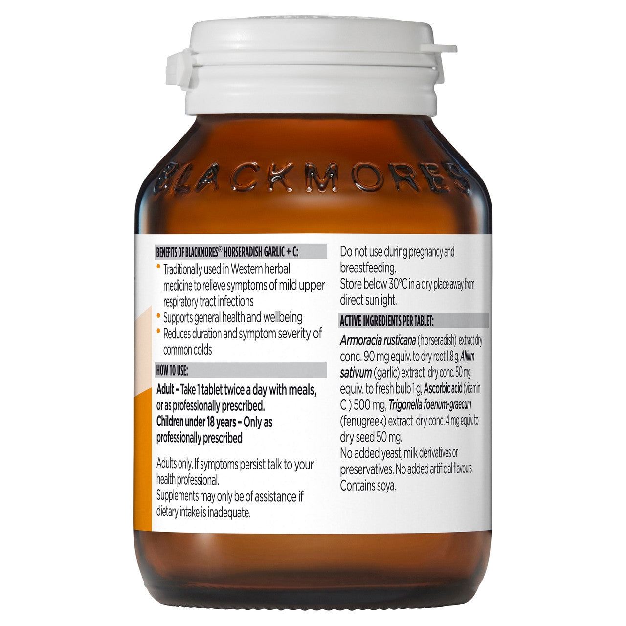Blackmores Horseradish Garlic + C is a combination formula including vitamin C to help reduce the duration and symptom severity of common colds and supports immune system health.