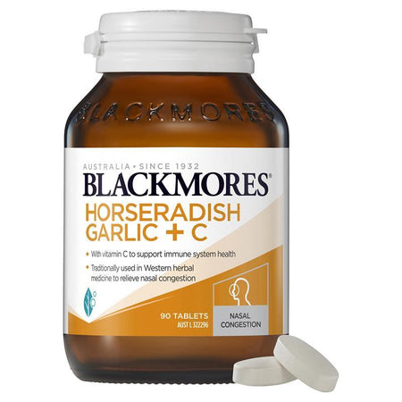Blackmores Horseradish Garlic + C is a combination formula to help relieve nasal congestion and support immune system health.