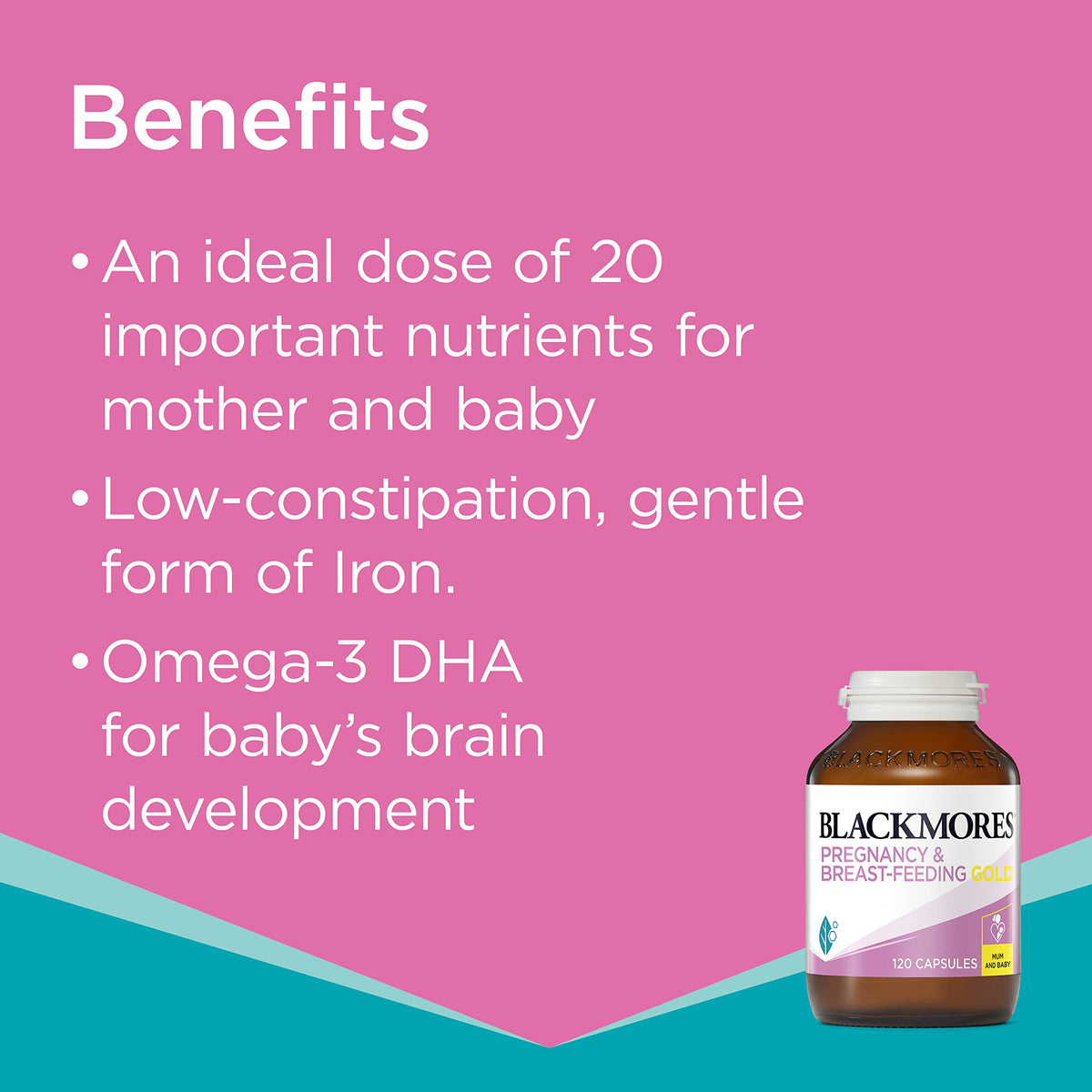 Blackmores Pregnancy & Breast-Feeding Gold provides an ideal daily dose of 20 important nutrients for mother and baby including folic acid, iodine and vitamin D3. With omega-3 DHA to support baby’s brain, eyesight and nervous system development and a lower constipation iron.