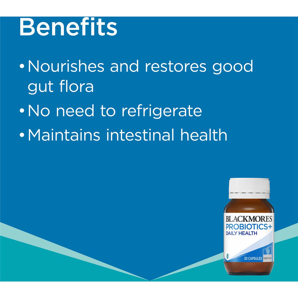 Blackmores Probiotics+ Daily Health is a daily probiotic formula plus a prebiotic to maintain intestinal health and relieve digestive discomfort.