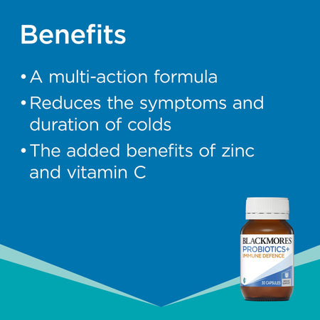 Blackmores Probiotics+ Immune Defence is a multi-action probiotic with five scientific strains, prebiotic, vitamin C & zinc.