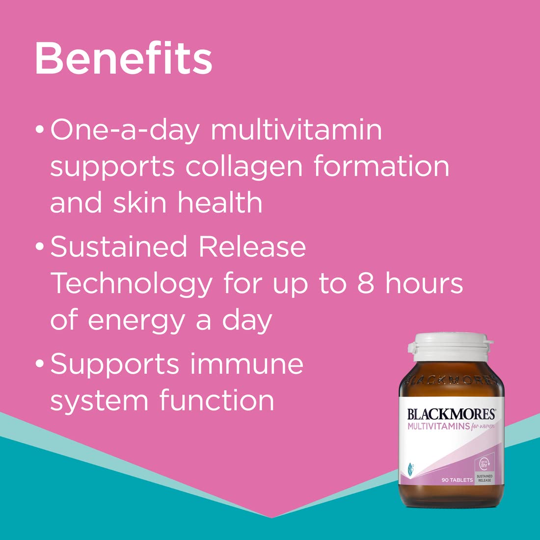 Made with a blend of 24 nutrients Blackmores Multivitamin for women supports a healthy stress response & energy production. It also helps relieve fatigue.